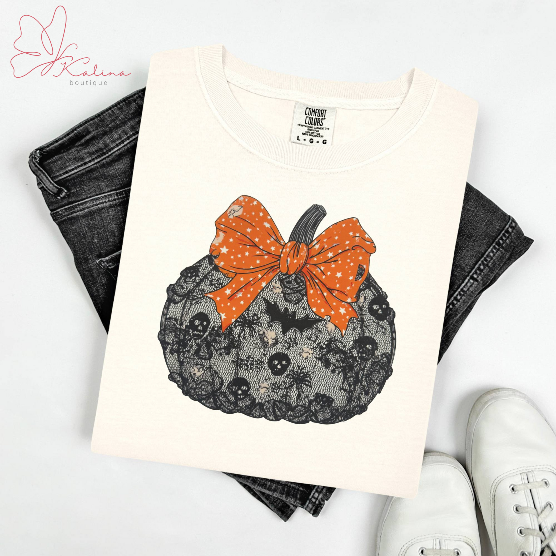 Add a touch of spooky-chic style in our Black Lace Pumpkin Tee. Featuring a bold pumpkin design dressed in intricate black lace details, topped off with a playful orange bow, this shirt is the perfect mix of festive and fashionable. Made with soft, comfortable fabric, it’s ideal for crisp fall days, Halloween parties, or simply for seasonal style. Pair it with jeans or leggings for an effortlessly cute autumn look.