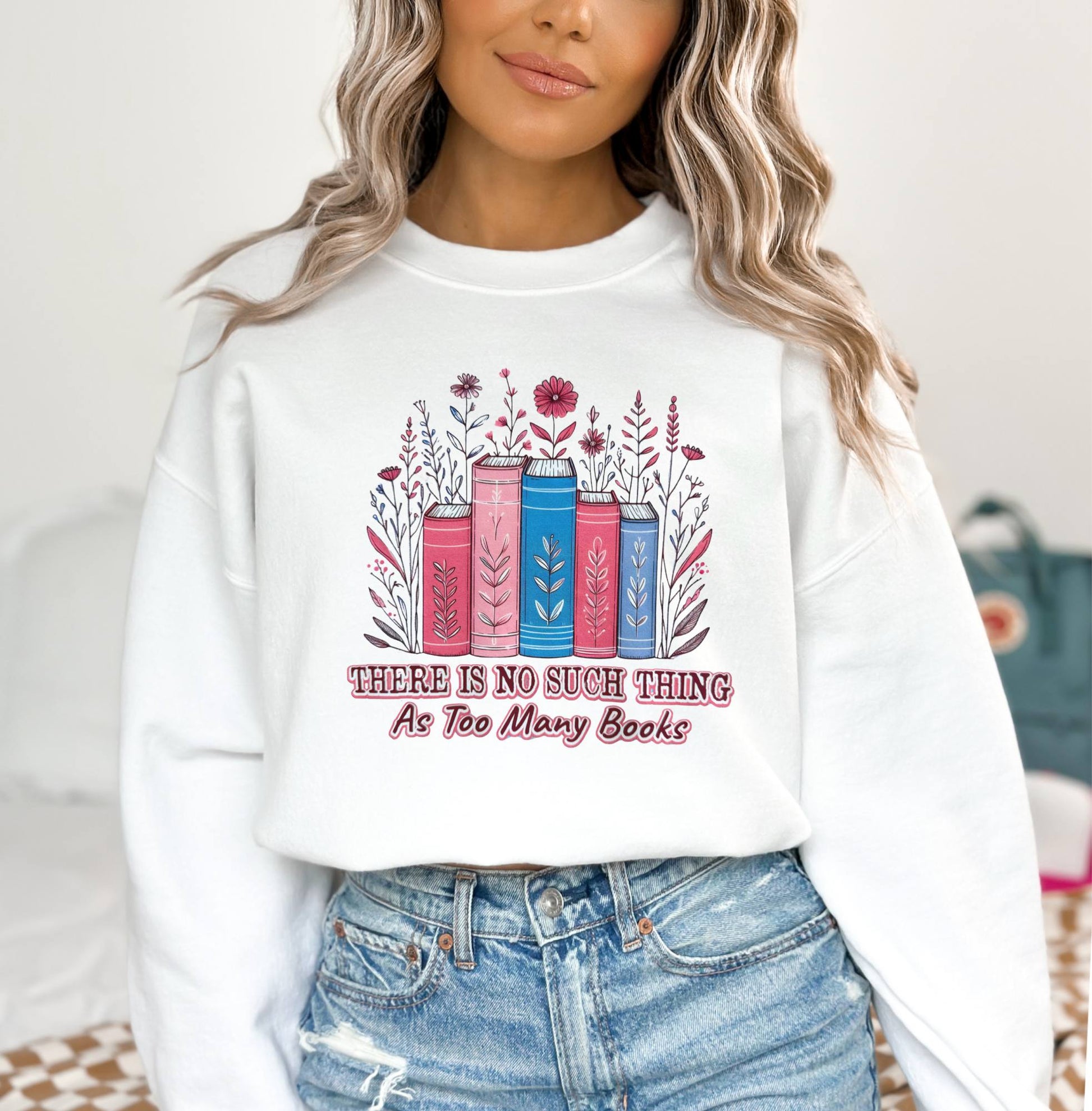Cozy up with your next great read in this charming light blue sweatshirt made just for book lovers. Featuring the playful phrase "There is no such thing as too many books" in a whimsical font, this sweatshirt is a warm hug for your literary soul.