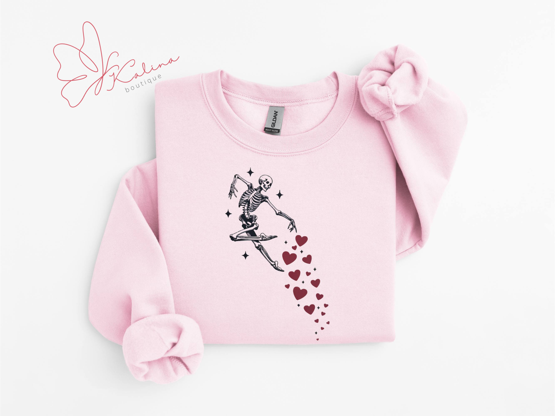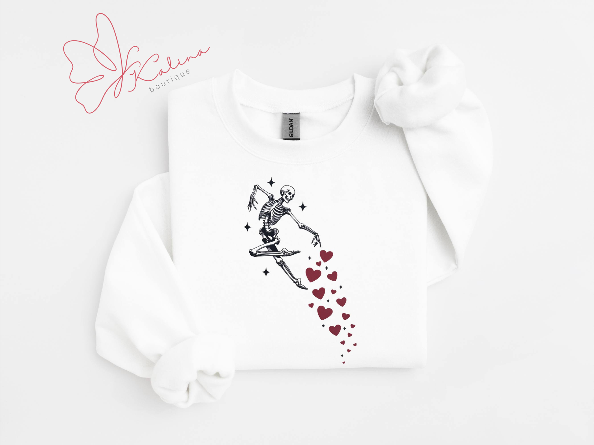This playful sweater featuring a jumping skeleton, frozen mid-leap, with bright red hearts trailing behind for the perfect mix of spooky and sweet. It’s a fun twist on classic Valentine’s style—made for anyone who loves to stand out while still feeling festive. Cozy, eye-catching, and easy to style, this sweater pairs effortlessly with jeans, skirts, or layered looks for a unique holiday outfit that’s anything but ordinary. Perfect for Valentine’s Day and beyond.