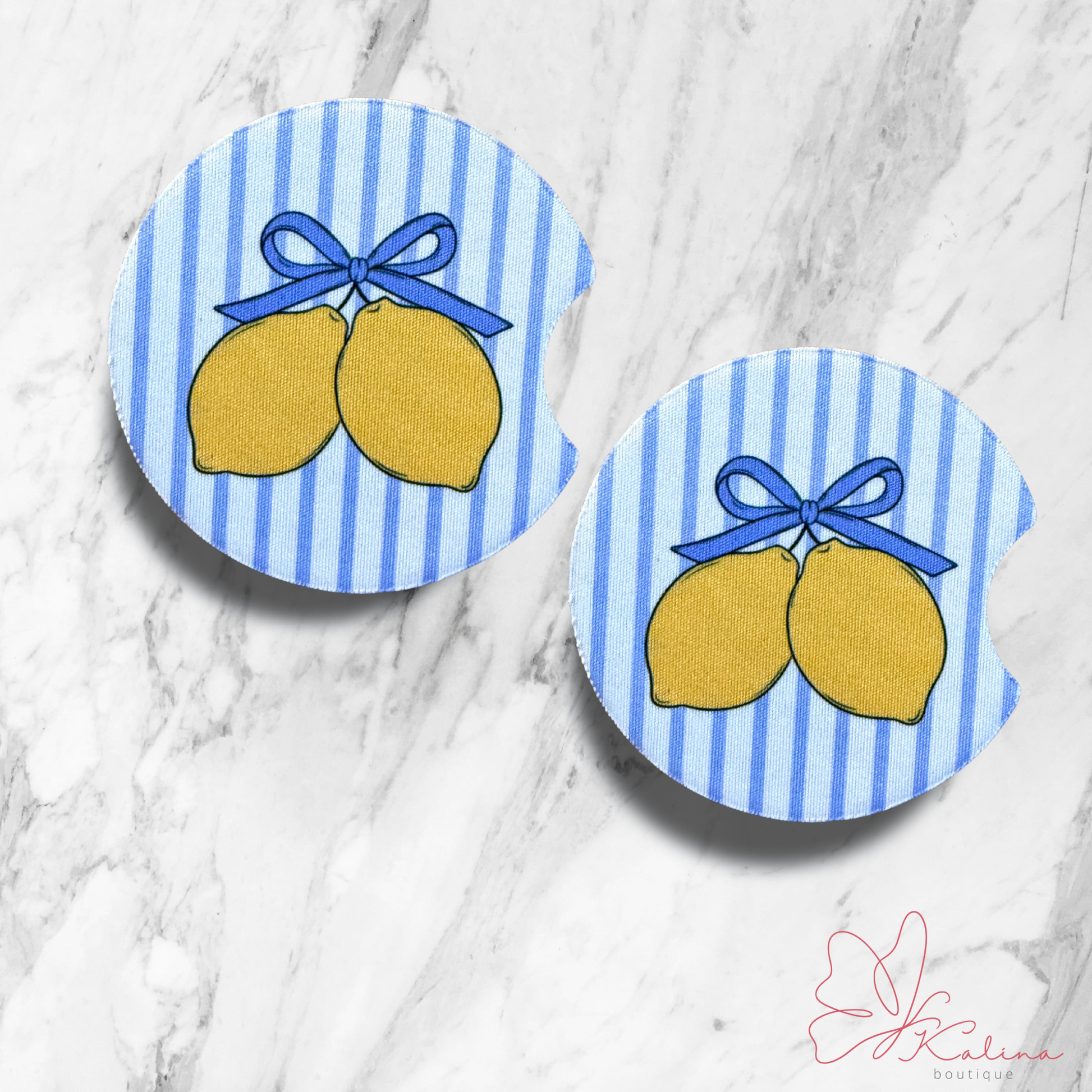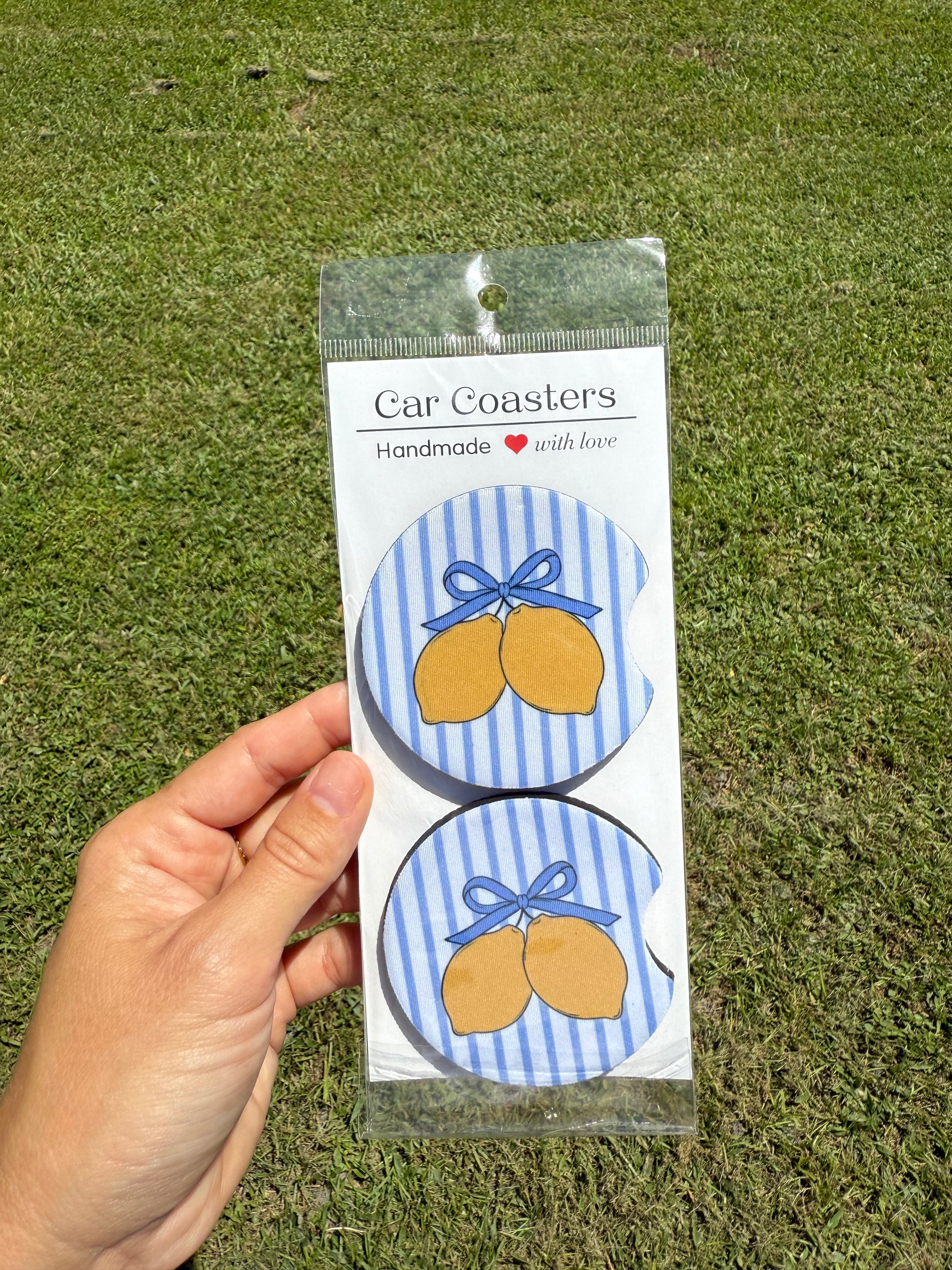Add a splash of citrusy charm to your cup holders with these adorable lemon car coasters. Featuring two bow-tied lemons on a soft striped background, they’re the perfect mix of cute and sassy. Not only do they keep your cup holders free from sticky messes and spills, but they also bring a little sunshine to every drive.
